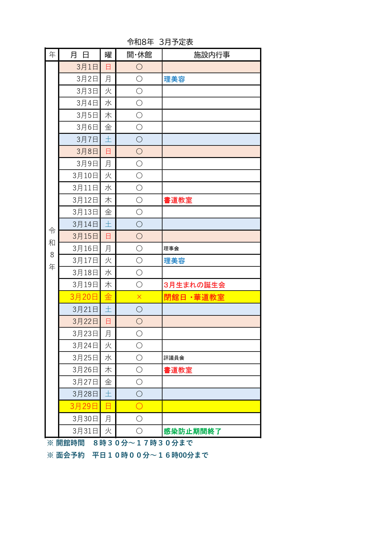 2026年3月予定カレンダーをアップします。